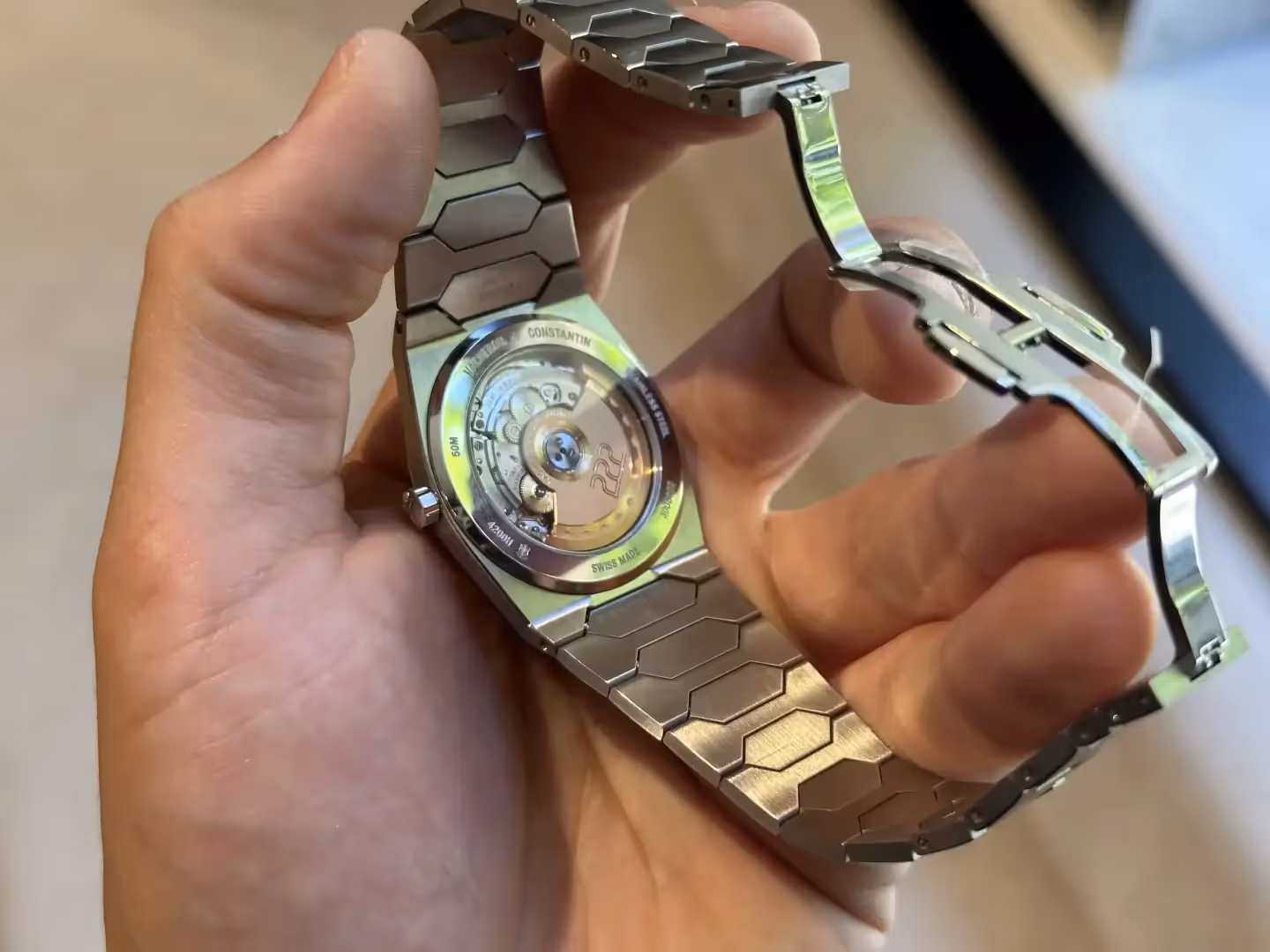 When I slipped the bracelet over my wrist I instantly got goosebumps, you can even see my hairs standing up in the photos. It's visceral. This has only happened once before when trying on a watch, the Piaget Polo 79 made my heart skip a beat and this is the same. That watch, however, is a little thicker than the 222 and tickles my fancy for different reasons. The VC is a second skin, with a bracelet that is silk-like in its articulation. It's an incredible feeling watch.